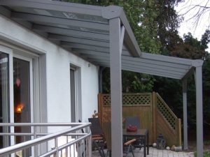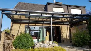 Drei Terrassendächer (6,00 m x 4,00 m) aus Leimholz mit Verbundsicherheitsglas in Oelde. Zwei Dächer sind 2010 gebaut worden, das dritte wurde Ende 2014 erstellt.