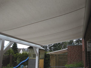 Terrassenüberdachung aus Leimholz mit Verbundsicherheitsglas mit den Maßen Breite 6,00 m x Tiefe 3,50 m. Das Terrassendach wurde auf das Hausdach montiert, da sonst nicht genug Kopffreiheit vorhanden wäre. Unter dem Dach hat der Kunde eine Verschattung aus Stoffbahnen angebracht.