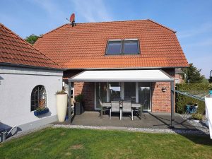 Dieses Alu-Terrassendach mit Unterglasmarkise, das die Maße 7 m x 3 m hat, wurde in Beckum errichtet. Die Pfosten wurden etwas eingerückt.