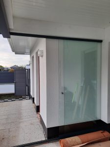 Seitenteil rechts als Wetter und Sichtschutz mit Milchglas.