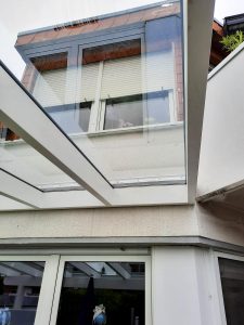 Das Alu- Terrassendach in Oelde hat eine Größe von 3,50 m x 3,50 m. Ausgestattet ist es mit Festelementen und einem Schiebefenster. Die Dacheindeckung wurde mit klarem Verbundsicherheitsglas ausgeführt.